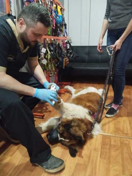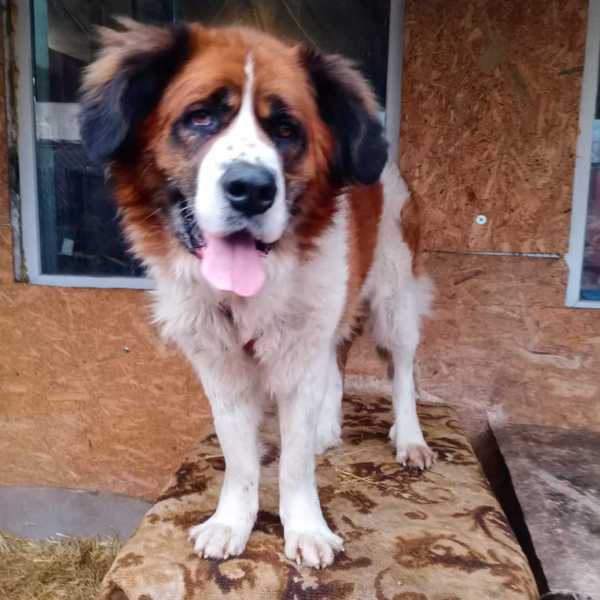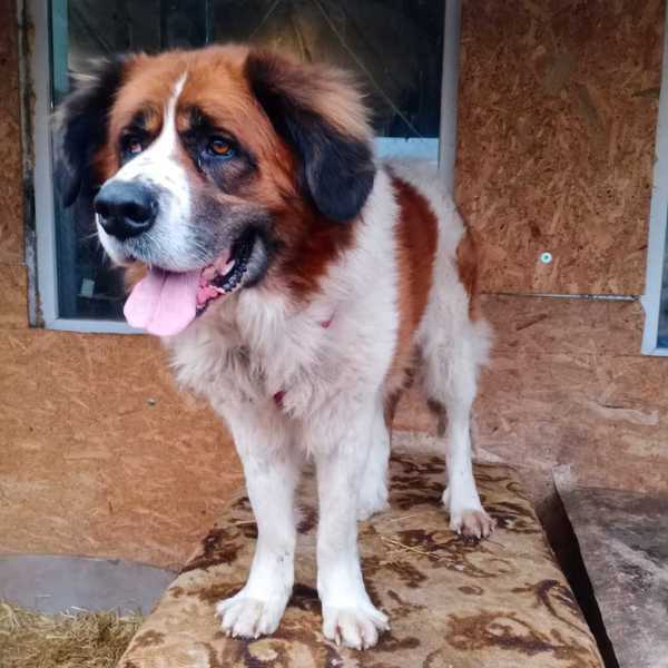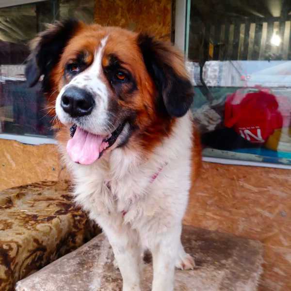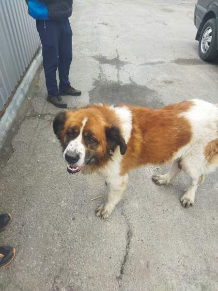 Unsere Lyuda und Alla fuhren sofort los und fanden diesen großen Hund, er gehört zu der Rasse Moskauer Wachhund.